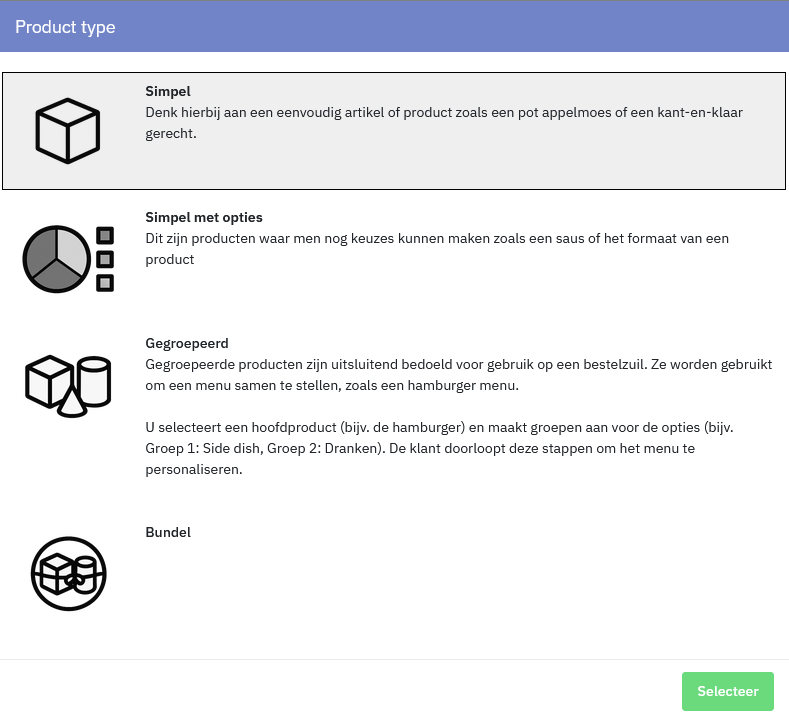 Het systeem is zo gebouwd dat het eigenlijk niet uit maakt welke optie je selecteert wanneer het gaat om een Simpel of Simpel met opties product. Wanneer het product wordt opgeslagen herkend het systeem direct of er opties zijn toegevoegd en slaat het product op met de juiste typering.