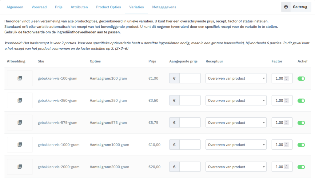 Na het opslaan verschijnt het tabje Variaties. Dit zijn de opties die op basis van jouw invulling zijn gegenereert en naar je webshop verzonden worden